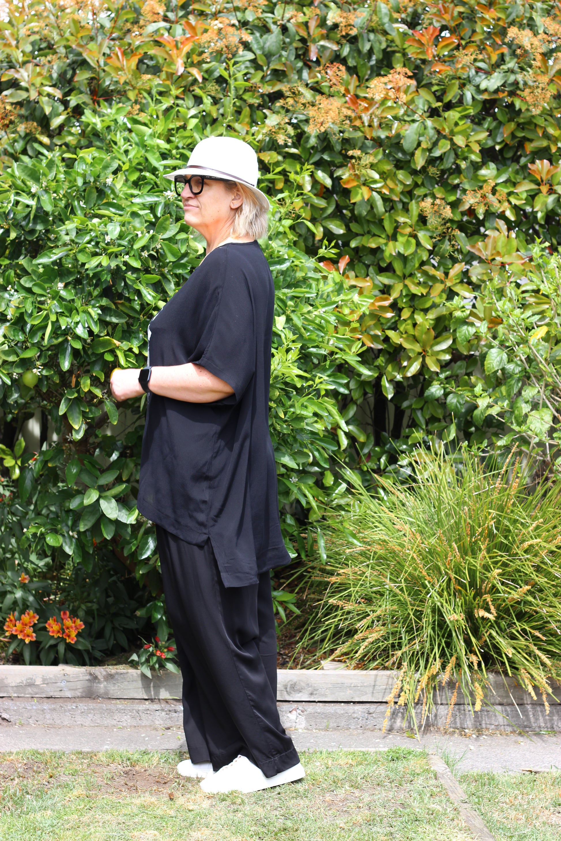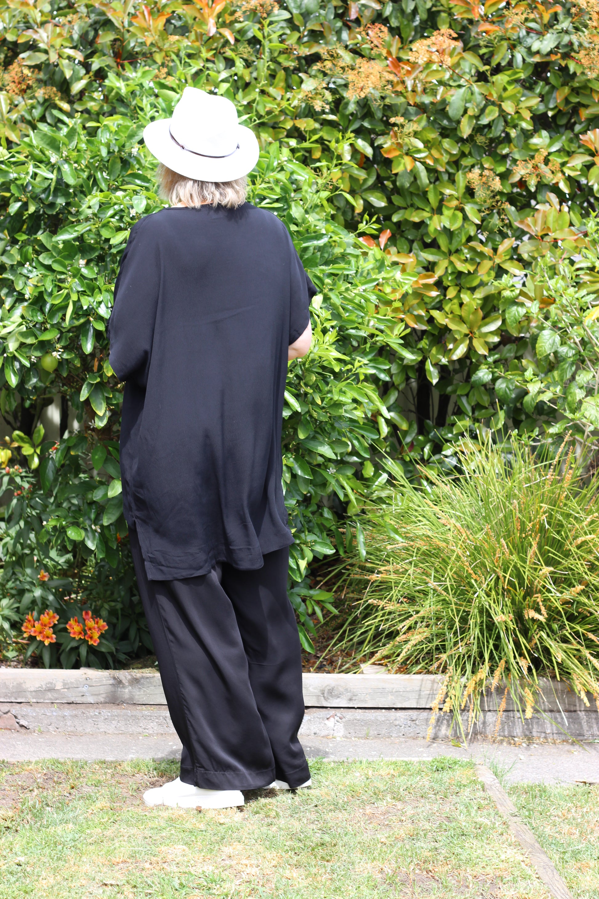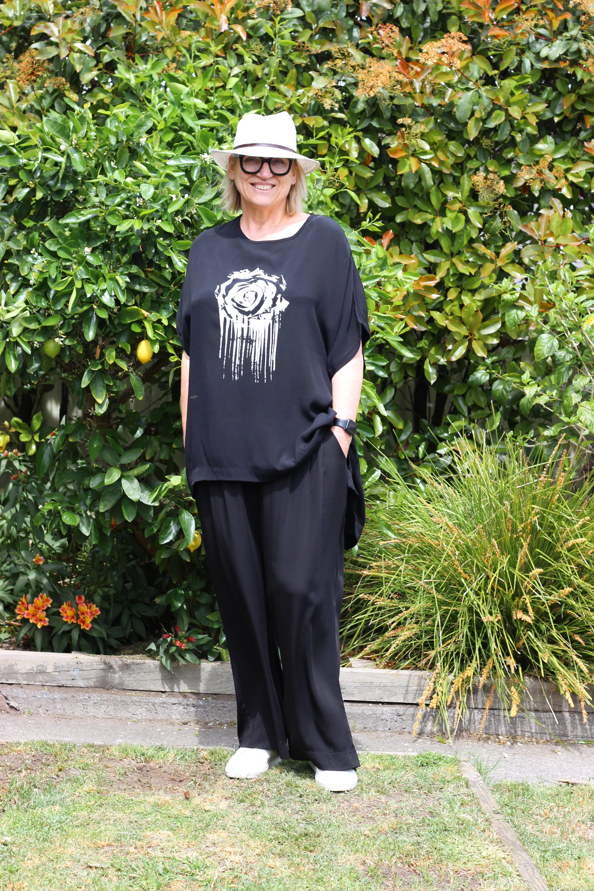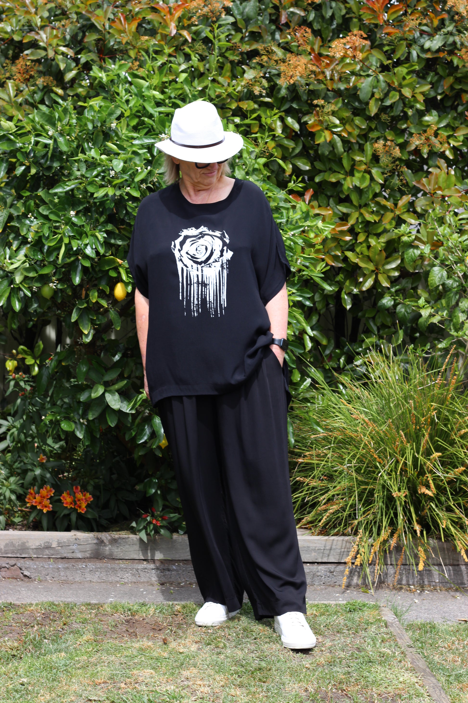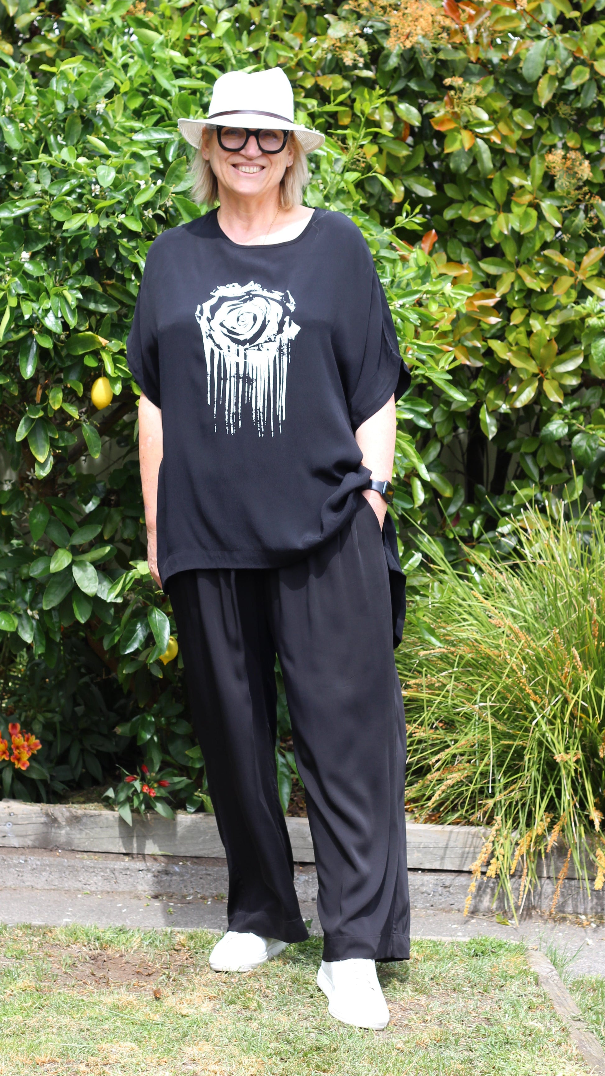 crafted in a non see through viscose crepe, has side splits with a step down hem. edgy 'crying rose' screen print to elevate simple but very wearable top.